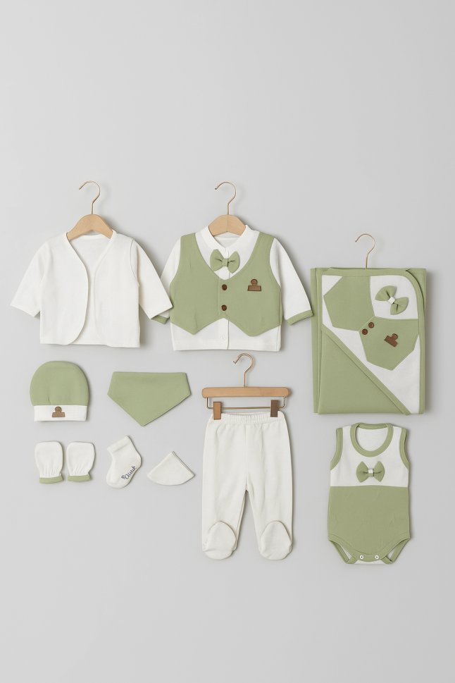 Acest set complet conține tot ce ai nevoie pentru a-ți îmbrăca bebelușul cu stil și confort: