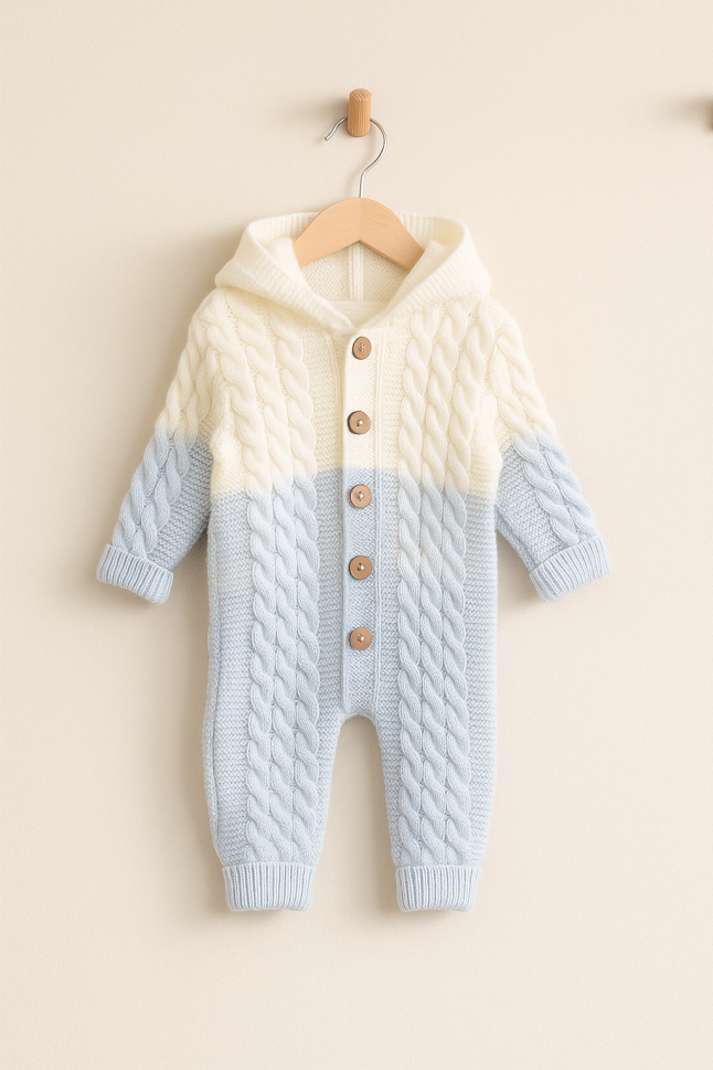 Îmbracă-l pe cel mic cu această adorabilă salopetă tricotată, perfectă pentru bebelușii de 6-12 luni!
