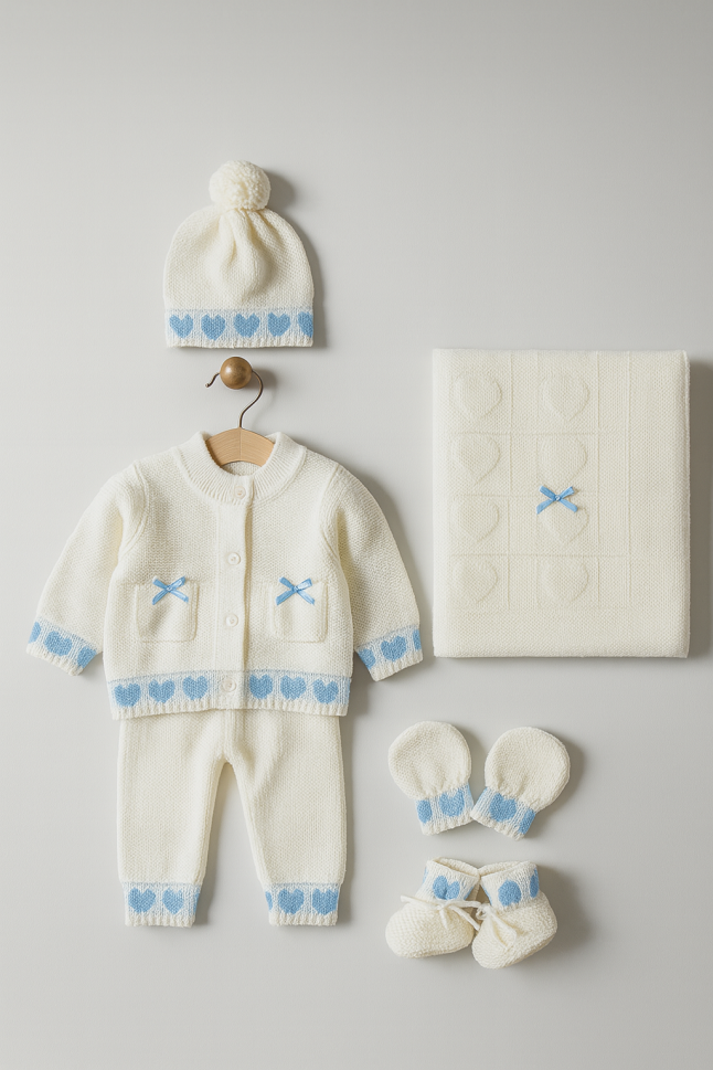 Oferă-i micuțului tău un start plin de căldură și confort cu acest set tricotat adorabil! Este, de asemenea, un cadou minunat pentru viitoarele mămici.