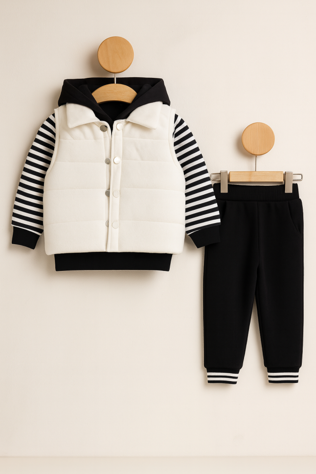 - Conținut: Hanorac, pantaloni, vestă pufoasă