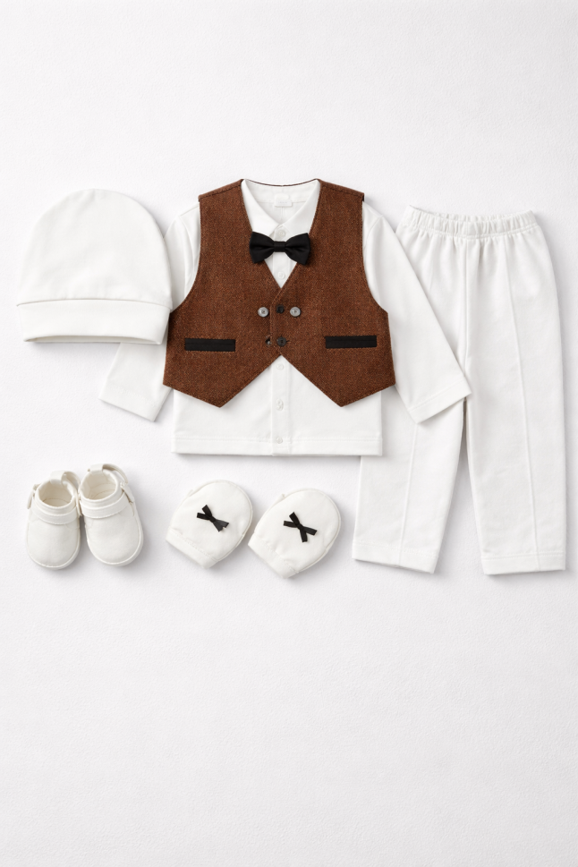 Acest set adorabil pentru bebeluși, mărimea 0-3 luni, este perfect pentru pielea sensibilă a nou-născutului. Fabricat în Turcia, setul include un maiou, pantaloni, mănuși, botine și o pălărie asortată.