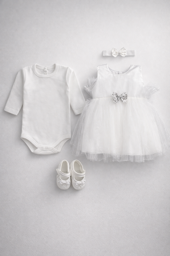 Acest set adorabil pentru bebeluși, mărimea 0-3 luni, este perfect pentru micuța ta! Fabricat în Turcia, setul include un body cu mânecă lungă, o rochiță delicată, botine călduroase și o bandană chic.