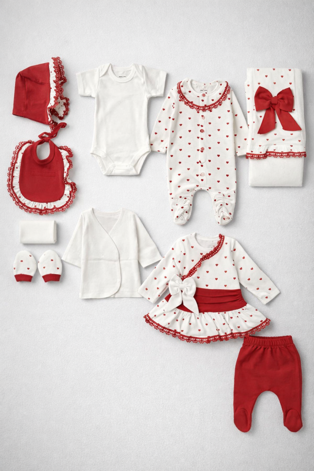 Set nou-născut MINICAYZEN cu fundă din dantelă în formă de inimă, 0-3 luni, format din 10 piese A108