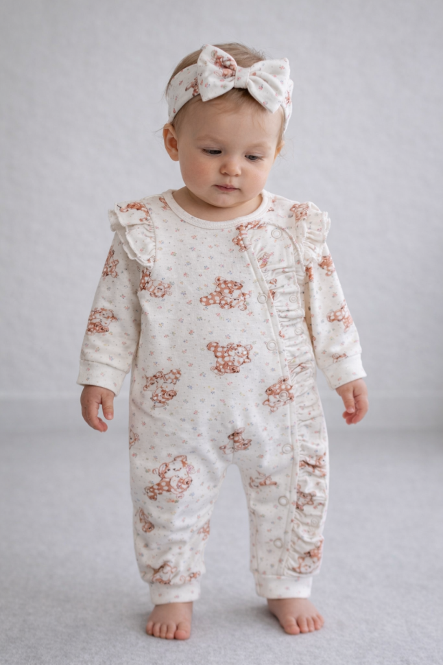 Îmbracă-ți bebelușul în confort și siguranță cu această adorabilă salopetă din bumbac 100%, perfectă pentru pielea sensibilă. Setul include și o bentiță asortată, ideală pentru a completa ținuta.