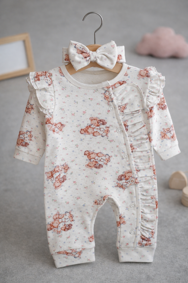 Îmbracă-ți bebelușul în confort și siguranță cu această adorabilă salopetă din bumbac 100%, perfectă pentru pielea sensibilă. Setul include și o bentiță asortată, ideală pentru a completa ținuta.
