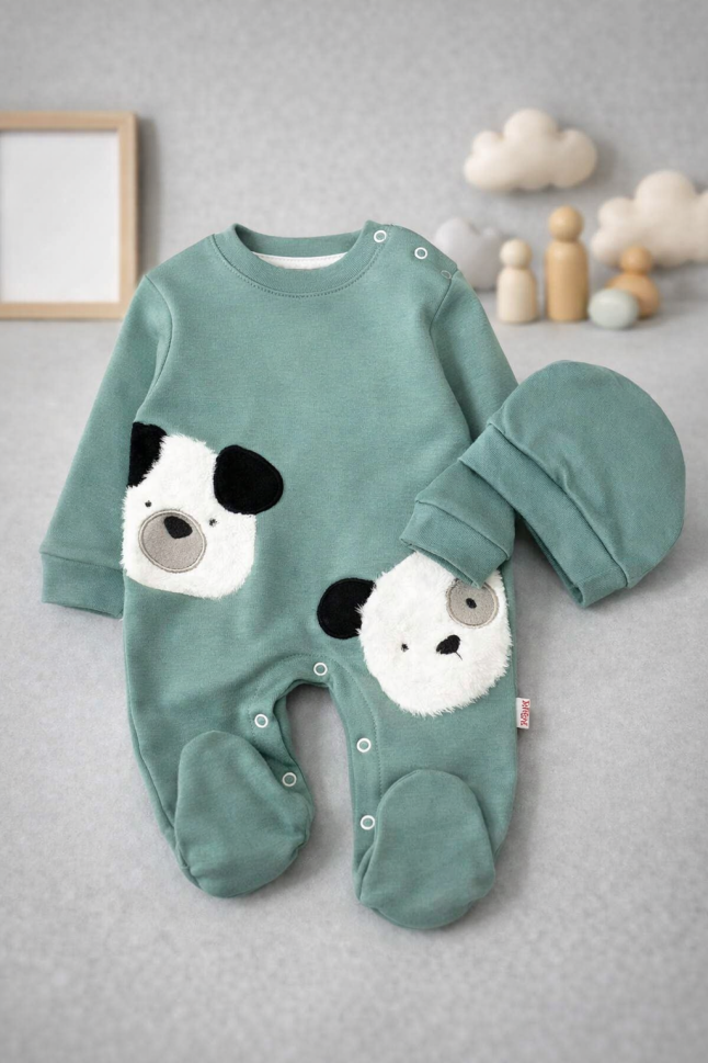 Îmbracă-ți bebelușul în confort cu această adorabilă salopetă și căciulă, perfecte pentru pielea sensibilă!
