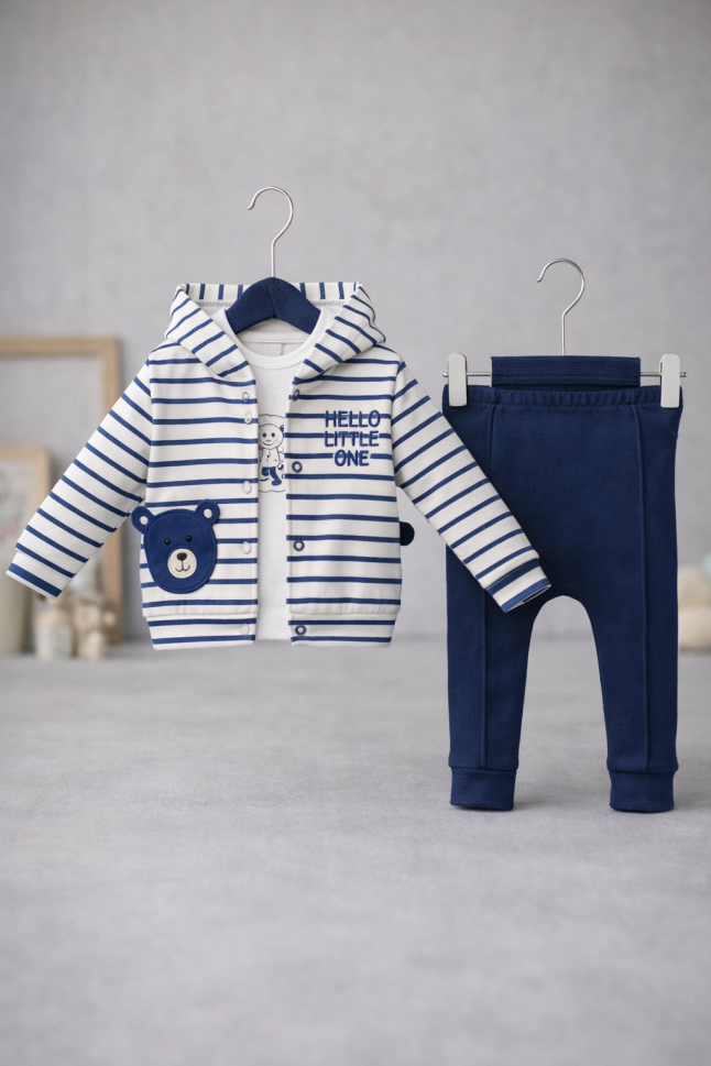 Descoperă setul perfect pentru micuțul tău! Fabricat din bumbac 100%, acest set include un hanorac, pantaloni și jachetă, ideal pentru bebeluși de 0-12 luni. Produs în Turcia, setul este testat și nu conține substanțe cancerigene sau alergene, asigurând siguranța și confortul bebelușului tău. Ușor de întreținut, se spală la mașină la 30°C.