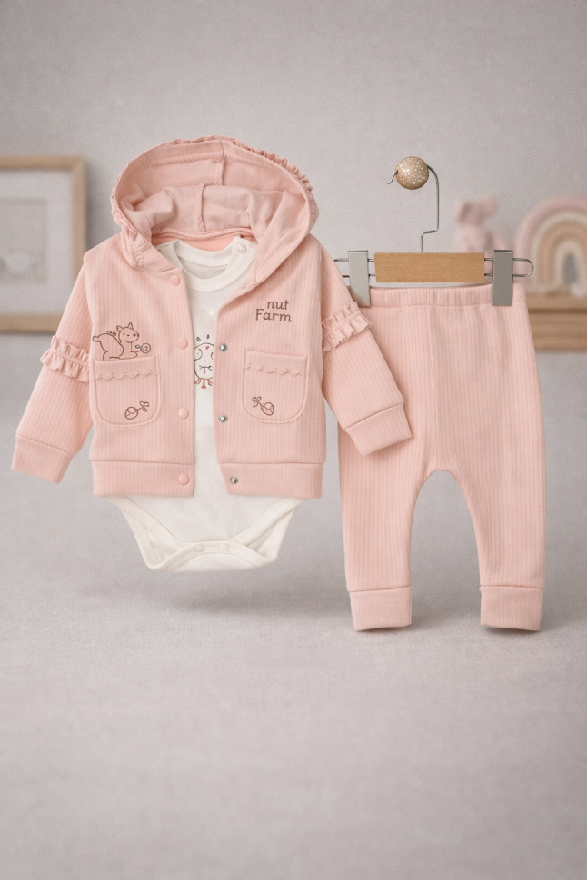 Descoperă setul perfect pentru bebeluși, ideal pentru pielea delicată! Fabricat în Turcia, acest set conține un body cu mânecă lungă, pantaloni și o jachetă adorabilă.