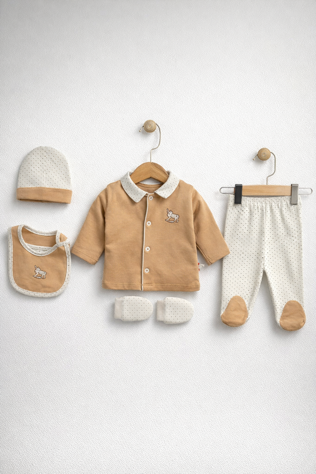 Set adorabil pentru bebeluși 0-3 luni, fabricat din bumbac 100%, ideal pentru pielea sensibilă a nou-născuților. Produs în Turcia, setul include body, pantaloni, căciulă, bavetă și mănuși.