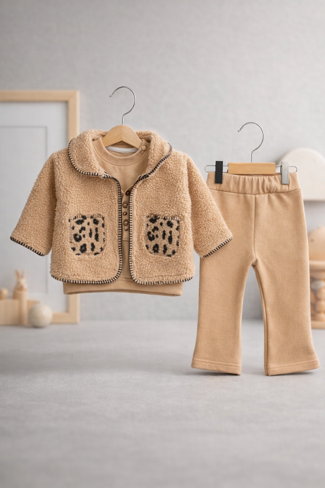 Descoperă confortul suprem pentru micuțul tău cu acest set adorabil fabricat în Turcia! Ideal pentru bebeluși de 6-24 luni, setul include un hanorac călduros, pantaloni confortabili și o jachetă moale din material Welsoft.