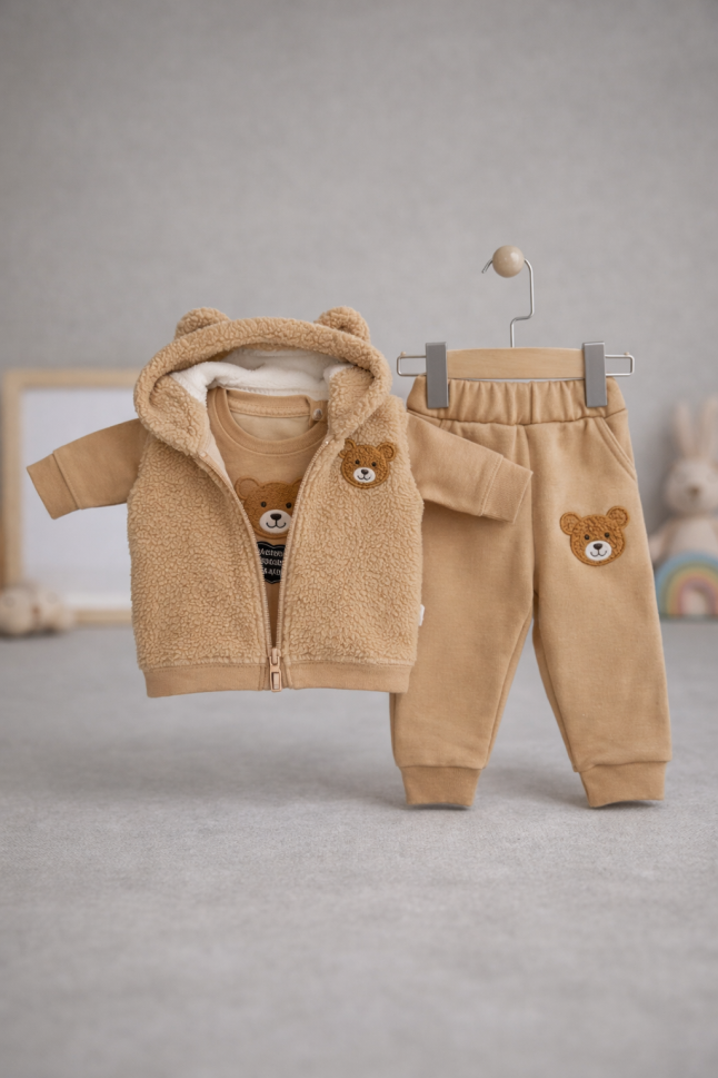 Fabricat în Turcia, setul include un hanorac călduros, pantaloni confortabili și o jachetă moale din material Welsoft.